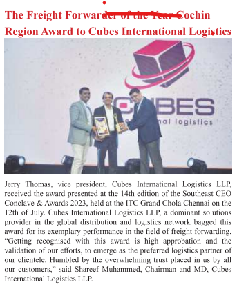 The Freight Forwarder of the Year Cochin Region Awards to Cubes International Logistics