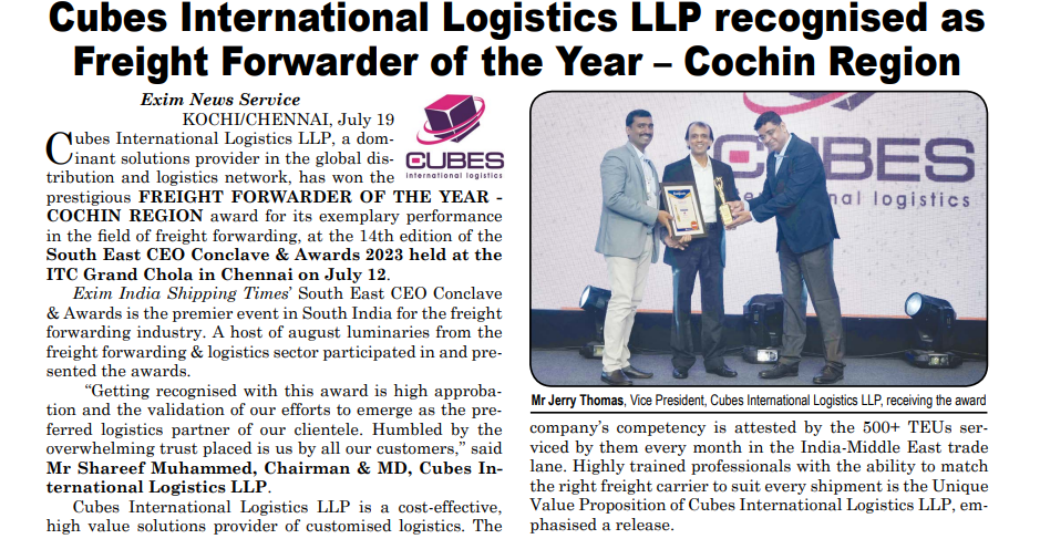 Cubes International Logistics LLP recognised as Freight Forwarder of the Year – Cochin Region